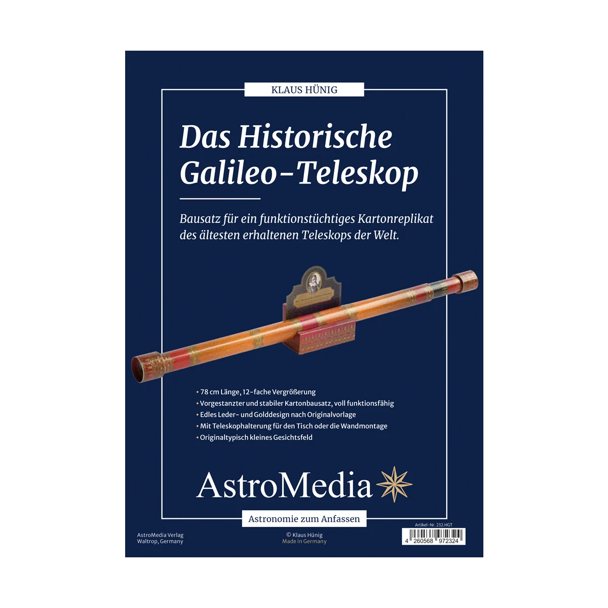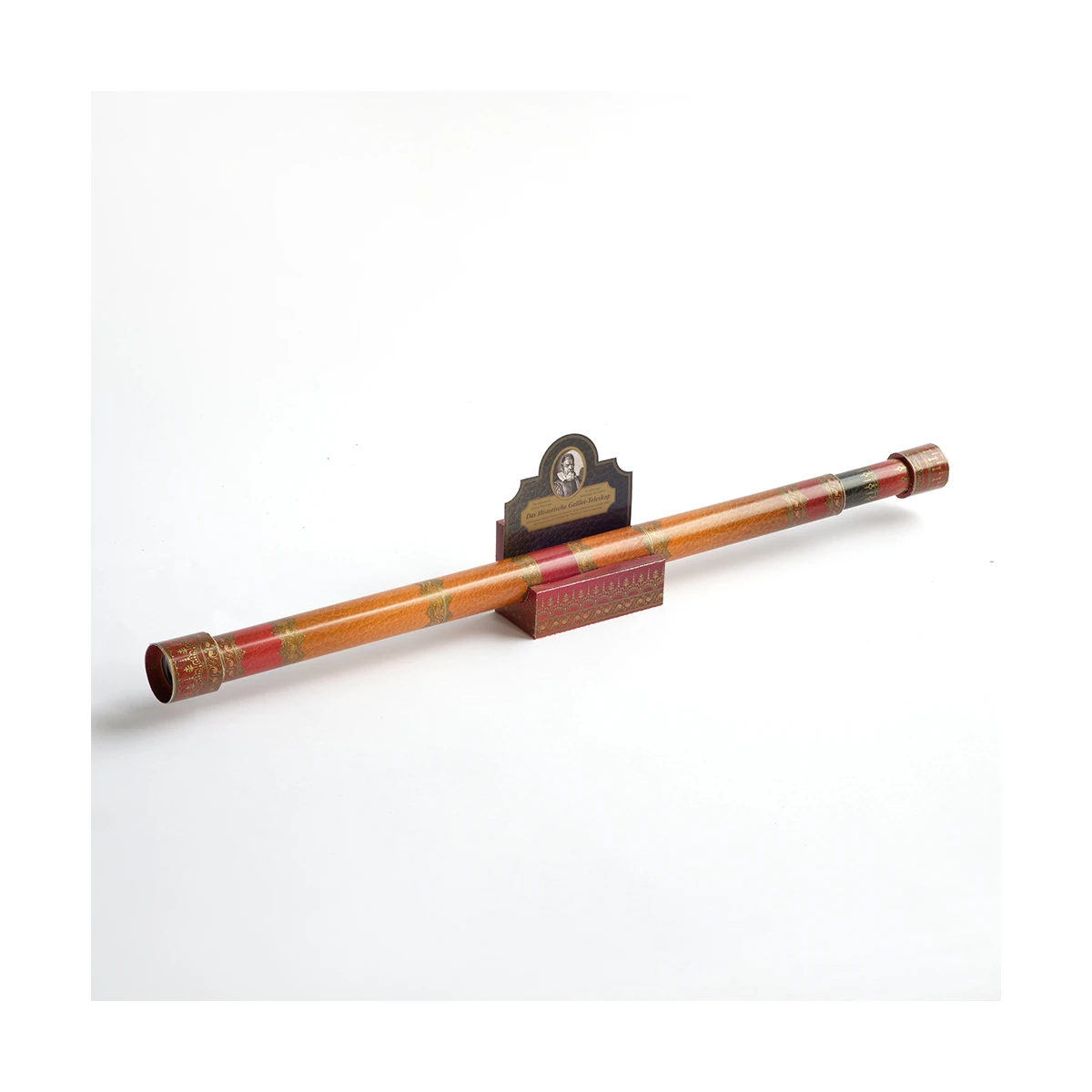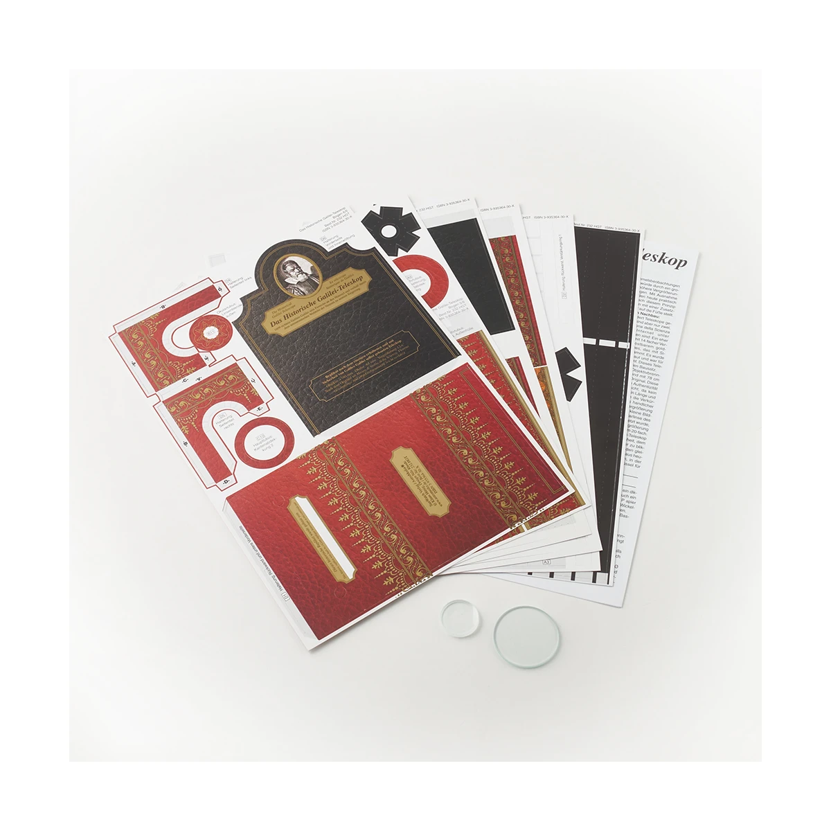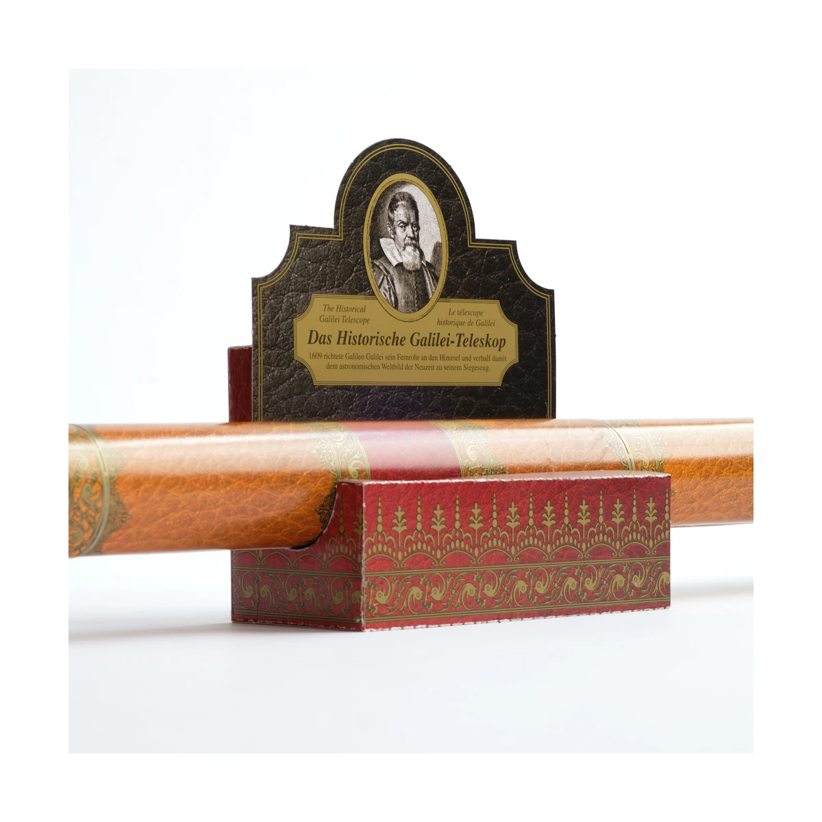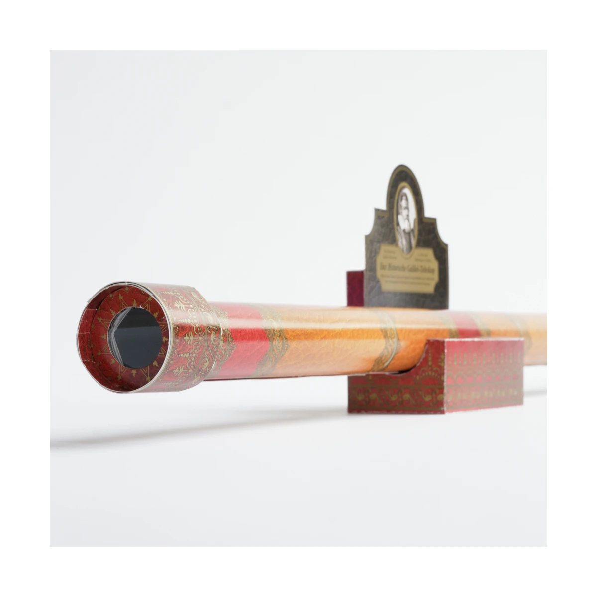 Dzięki tej wiernej historycznie replice kartonowej możesz bezpośrednio przeżyć wielkie osiągnięcia badawcze Galileusza, które osiągnął pomimo skromnej, według dzisiejszych standardów, wydajności optycznej swojego teleskopu. Zestaw odpowiada rozmiarom i właściwościom optycznym teleskopów z tamtego okresu i opiera się na jedynym zachowanym teleskopie, który z całą pewnością można przypisać Galileuszowi, najstarszym teleskopie na świecie: okazały egzemplarz pokryty skórą i zdobiony złotymi tłoczeniami, przeznaczony dla Cosimo II de Medici, który obecnie jest eksponowany we Florencji.