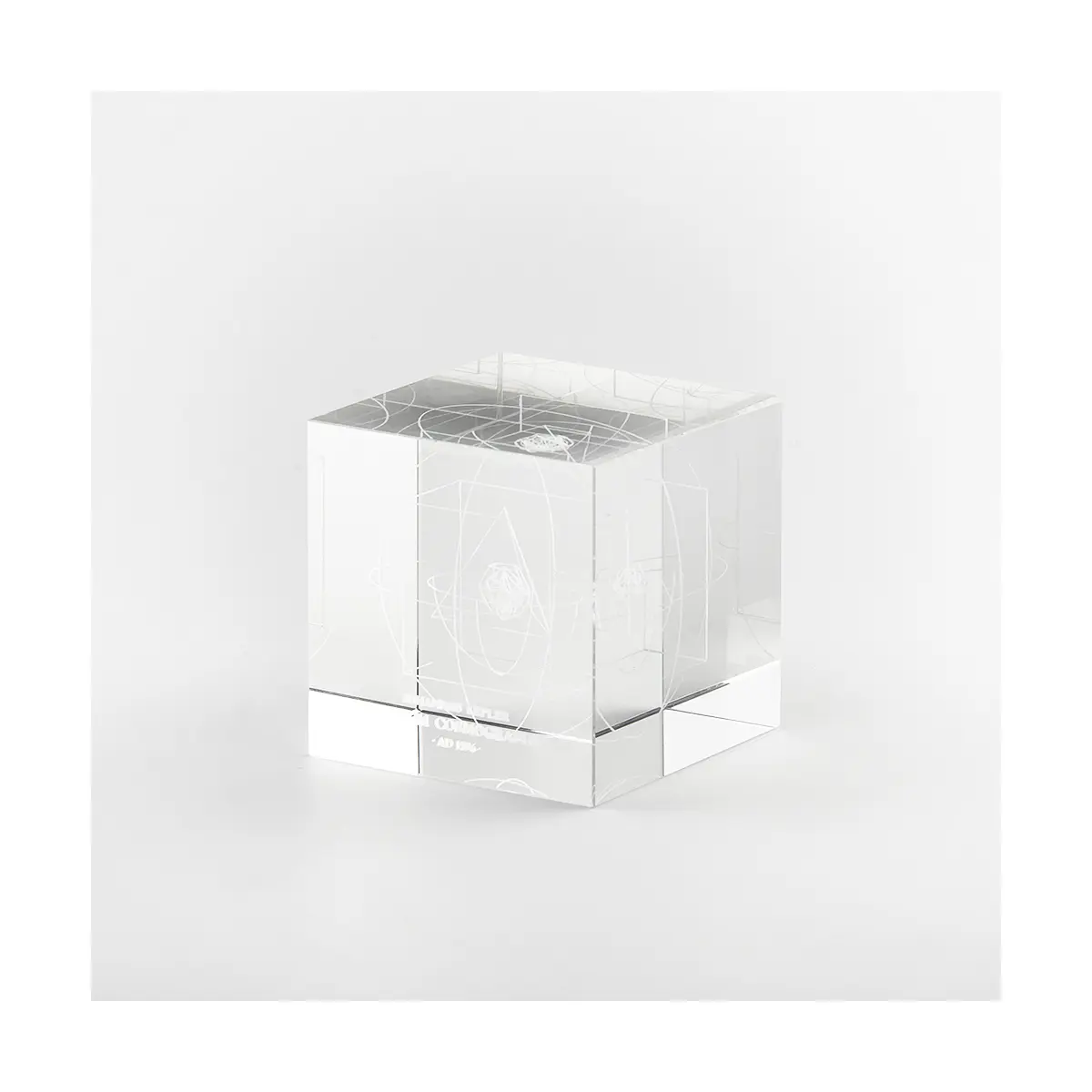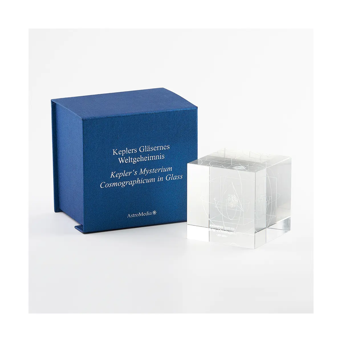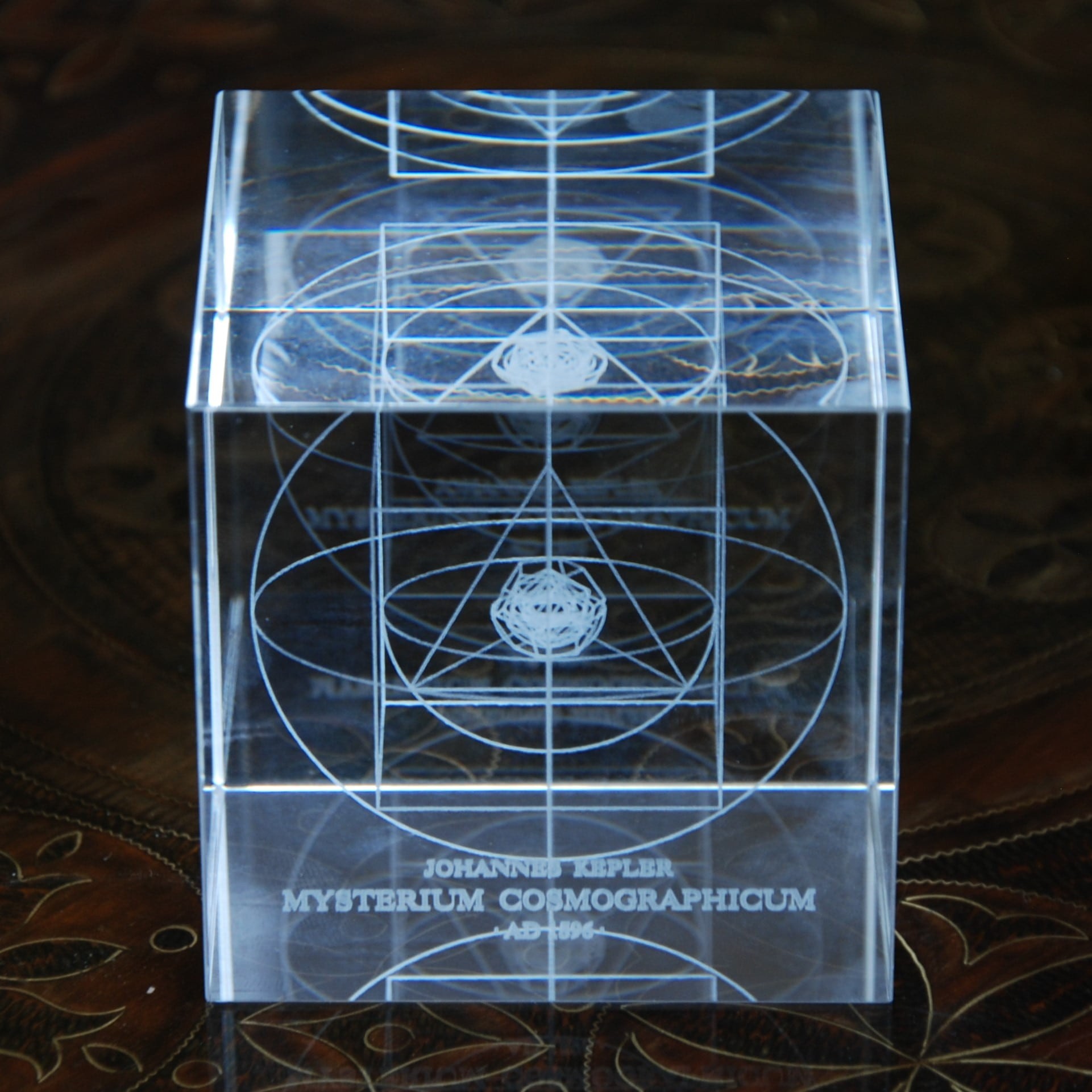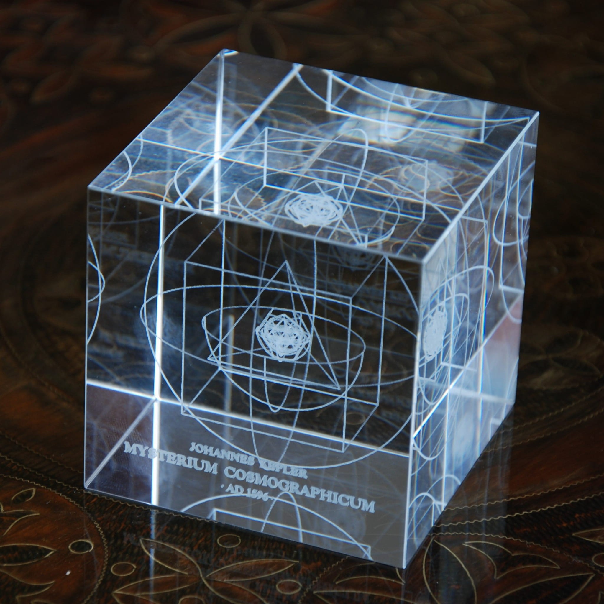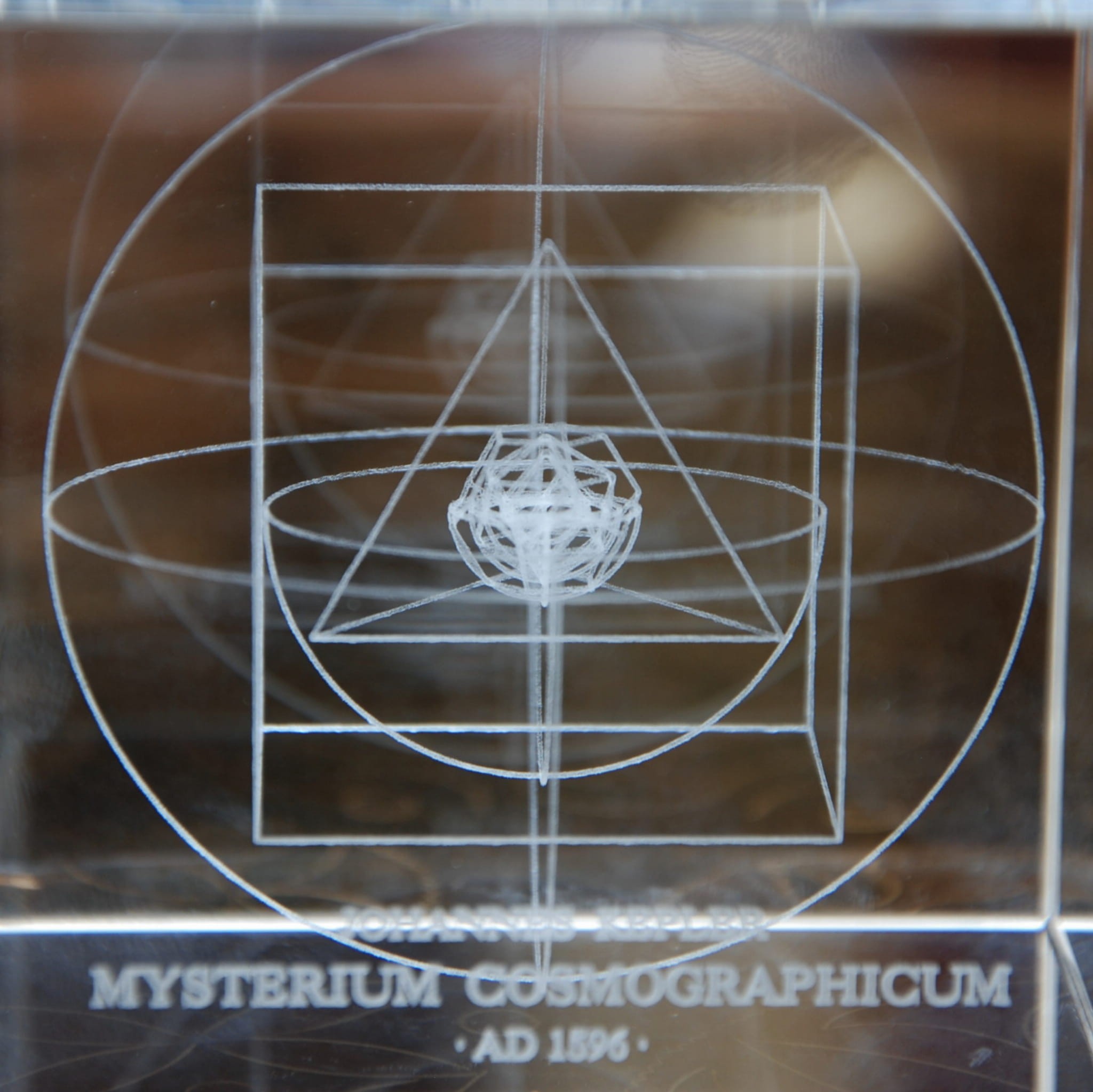 Rysunek ten, przedstawiający zagnieżdżone w sobie bryły platońskie i znajdujące się pomiędzy nimi orbity planet wewnątrz sześcianu, składa się z setek tysięcy mikroskopijnych punktów, które zostały wytopione w szkle od zewnątrz za pomocą silnego precyzyjnego lasera. Linie o grubości zaledwie 0,3 mm, które są szczególnie wyraźne przy oświetleniu bocznym, dokładnie odwzorowują model aż do jego najmniejszych struktur wewnętrznych. Historyczna i astronomiczna rzadkość.