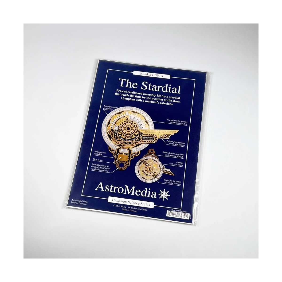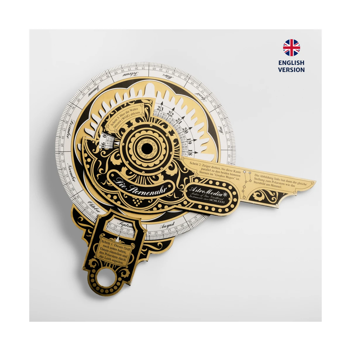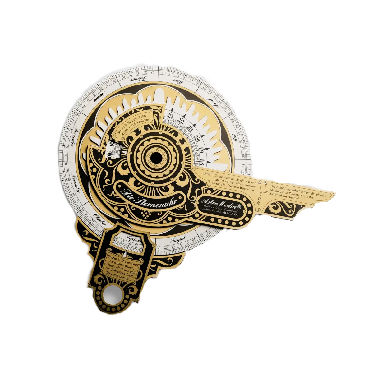 Zegar gwiazdowy zbudowany jest z wielowarstwowego, solidnego, lakierowanego kartonu. Z tyłu zegara znajduje się astrolabium do określania wysokości słońca, gwiazd i innych punktów orientacyjnych.