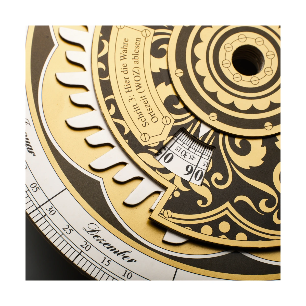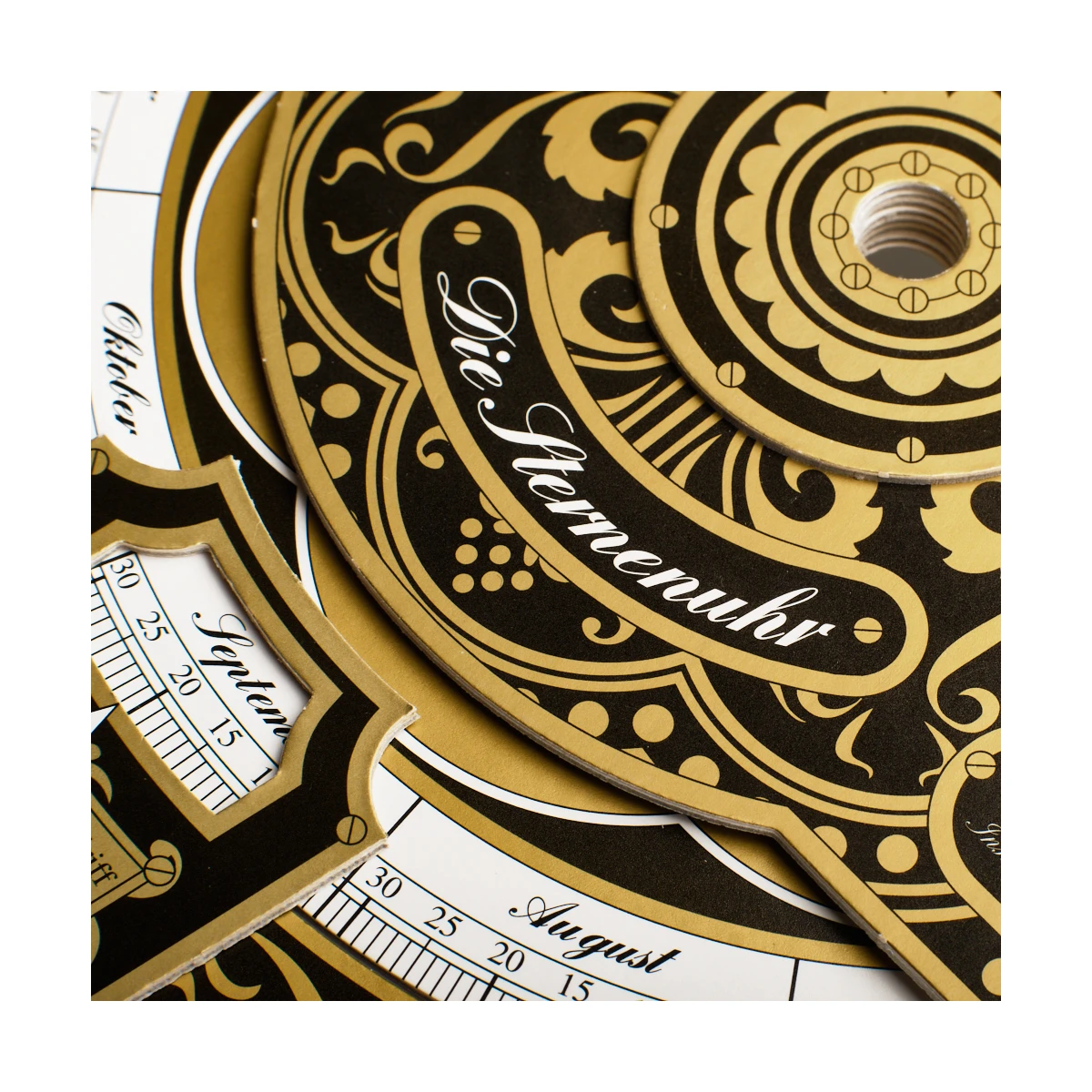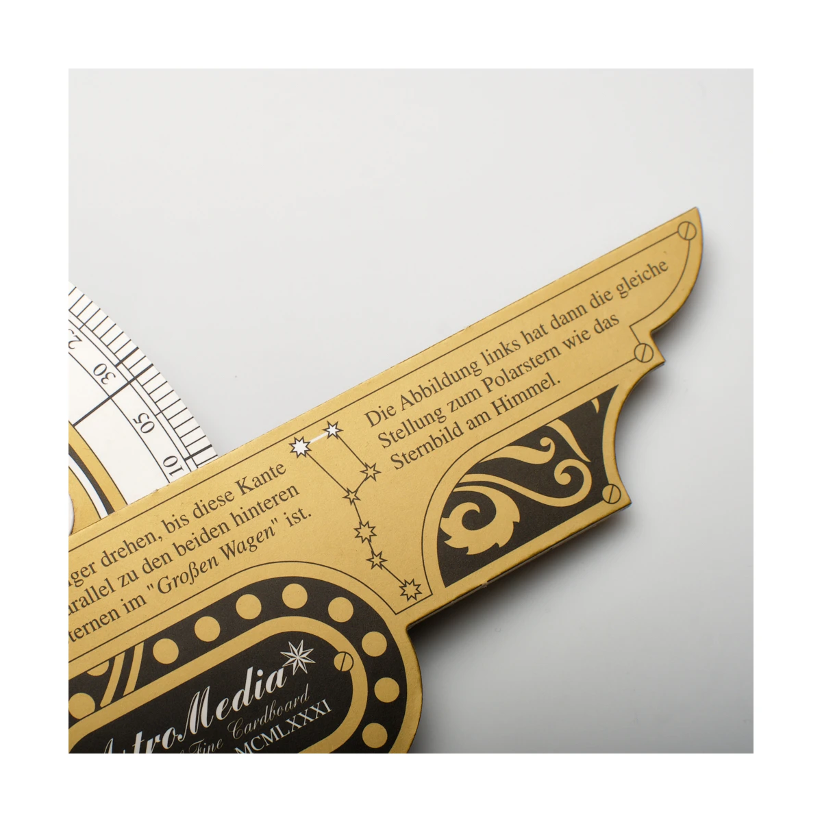 Zegar gwiazdowy zbudowany jest z wielowarstwowego, solidnego, lakierowanego kartonu. Z tyłu zegara znajduje się astrolabium do określania wysokości słońca, gwiazd i innych punktów orientacyjnych.
