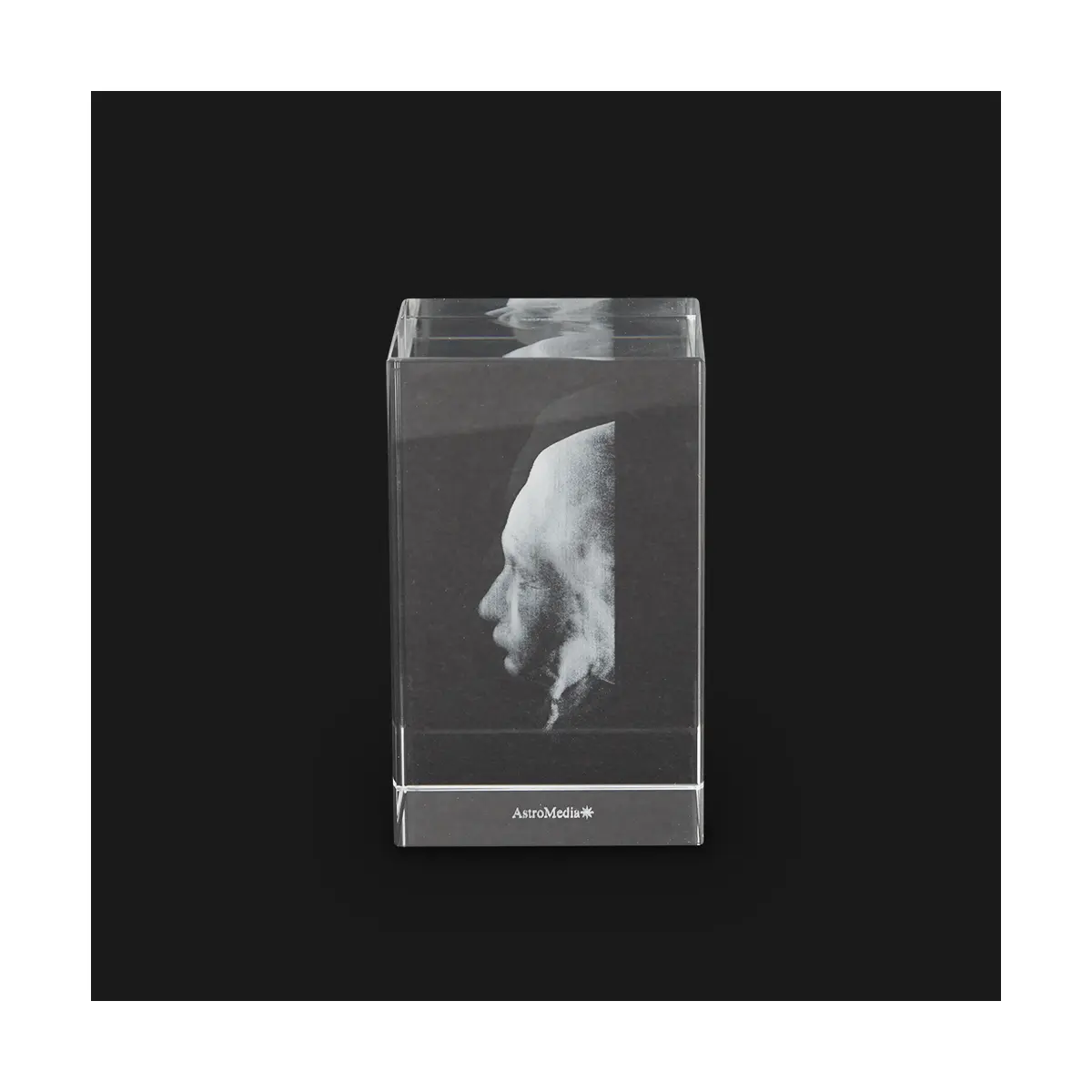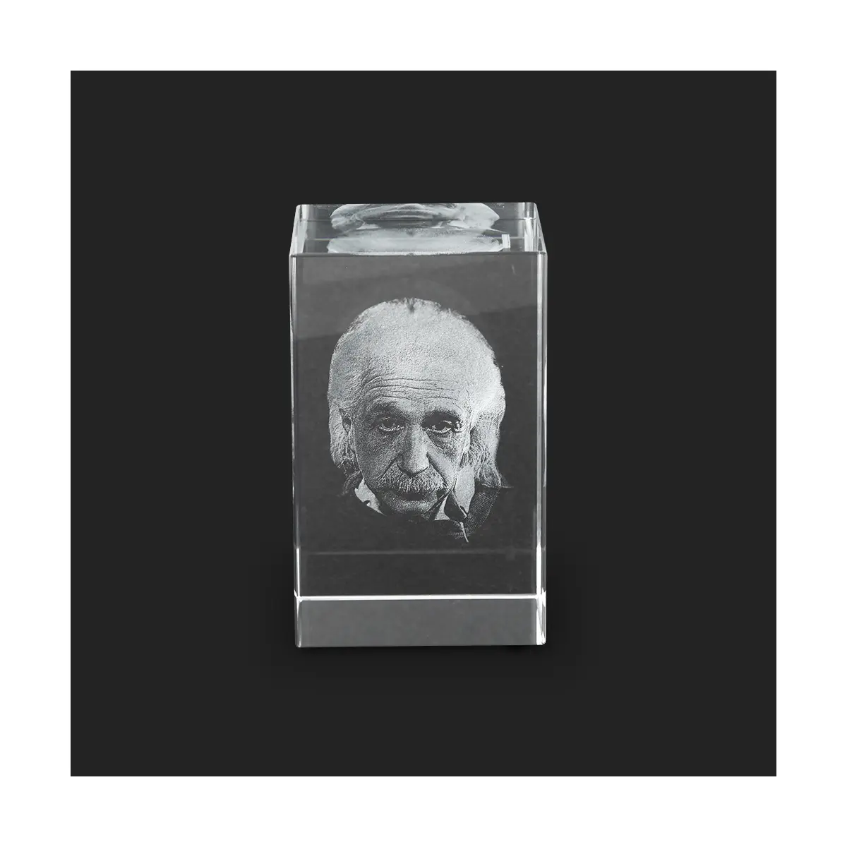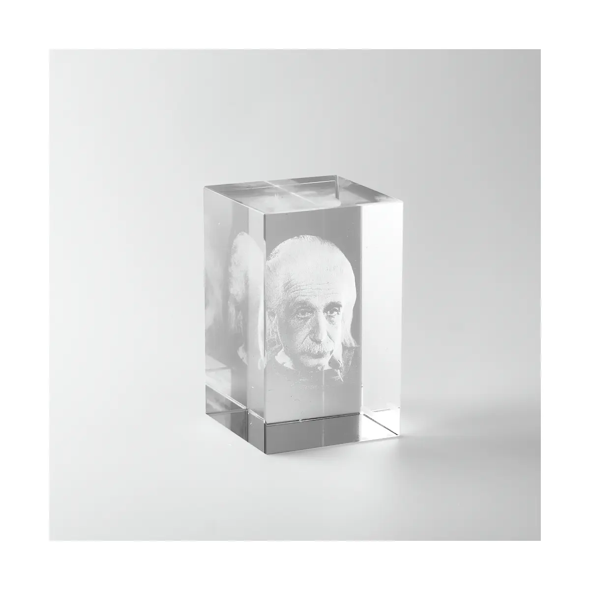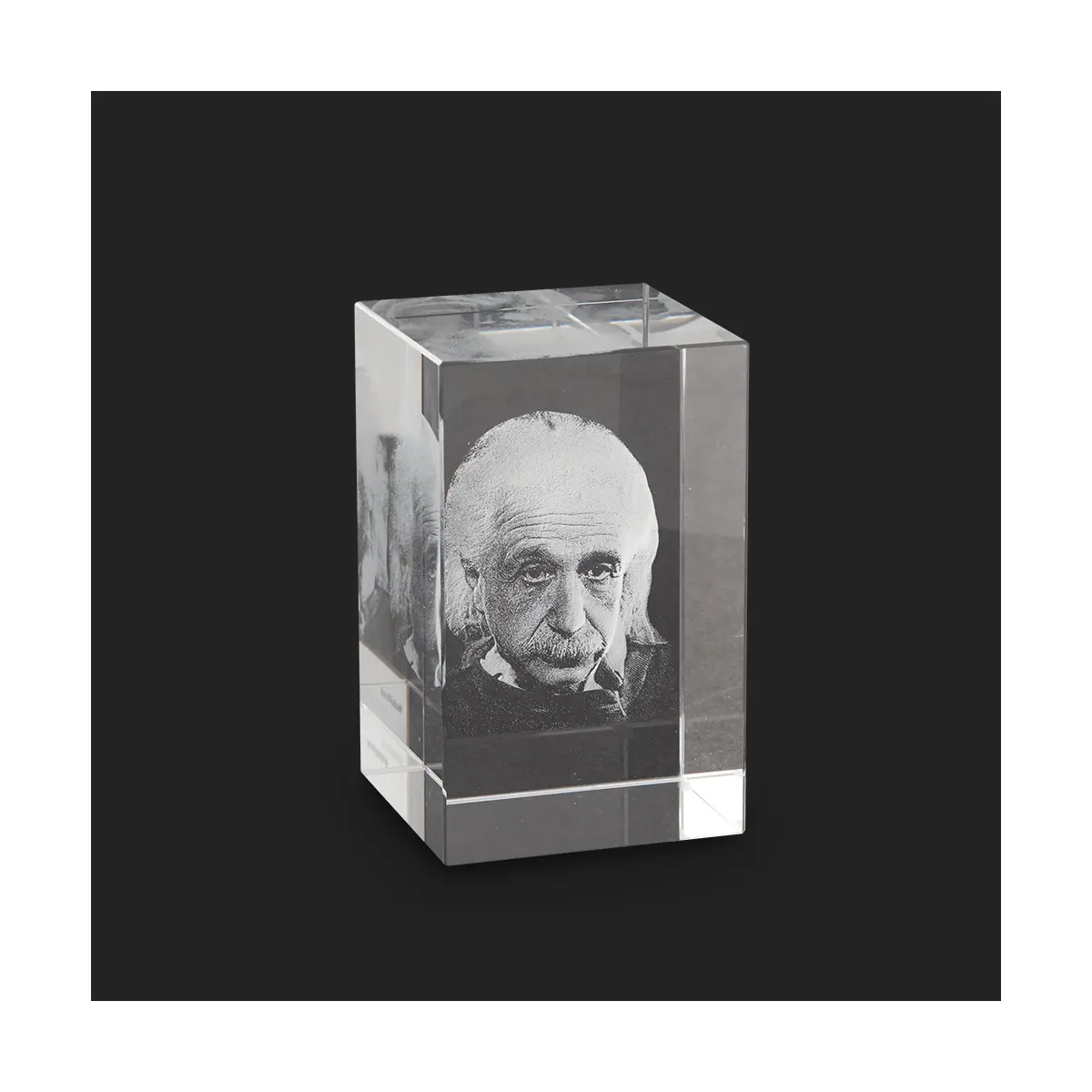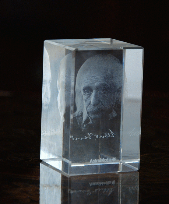 Wygrawerowana laserowo twarz słynnego fizyka doskonale ilustruje tzw. odwrócenie głębi, jedno z najsilniejszych złudzeń optycznych, któremu prawie nikt nie jest w stanie się oprzeć. Patrząc od tyłu na negatywową formę twarzy i poruszając szklanym prostopadłościanem w przód i w tył, można odnieść wrażenie, że oczy podążają za obserwatorem.