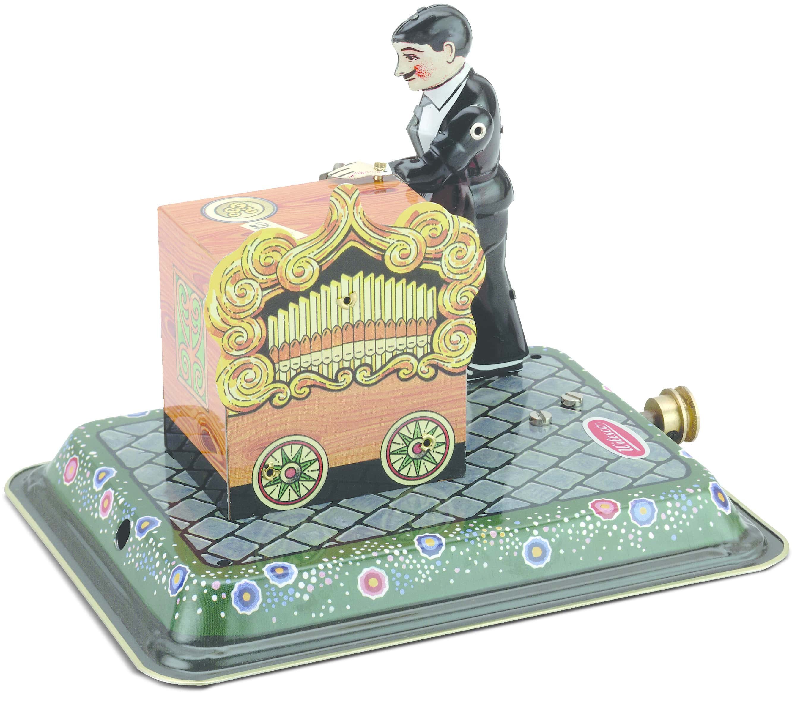 Wykonany ze starannie lakierowanej blachy model kataryniarza z grającą katarynką (katarynka wydaje dźwięki pozytywki).