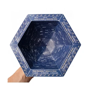 Za pomocą tego zestawy zbudujesz niewielką (Ø 21 cm) kopułę z naniesionymi podstawowymi gwiazdami i konstelacjami nieba północnej i środkowej Europy. Znajdujące się na mapie daty i godziny ułatwiają znalezienia danej konstelacji.