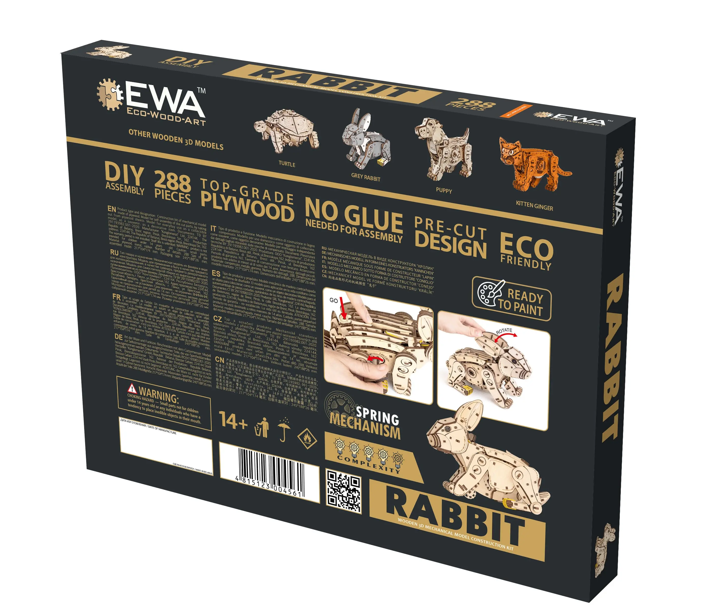 Model jest wykonany z naturalnego drewna - sklejki: wszystkie elementy są precyzyjnie wycięte, przyjemne w dotyku i łatwe w montażu. Montaż modelu rozwija logiczne myślenie, koncentrację i zdolności motoryczne, a gotowy Królik staje się oryginalną dekoracją wnętrz lub niezwykłym prezentem.