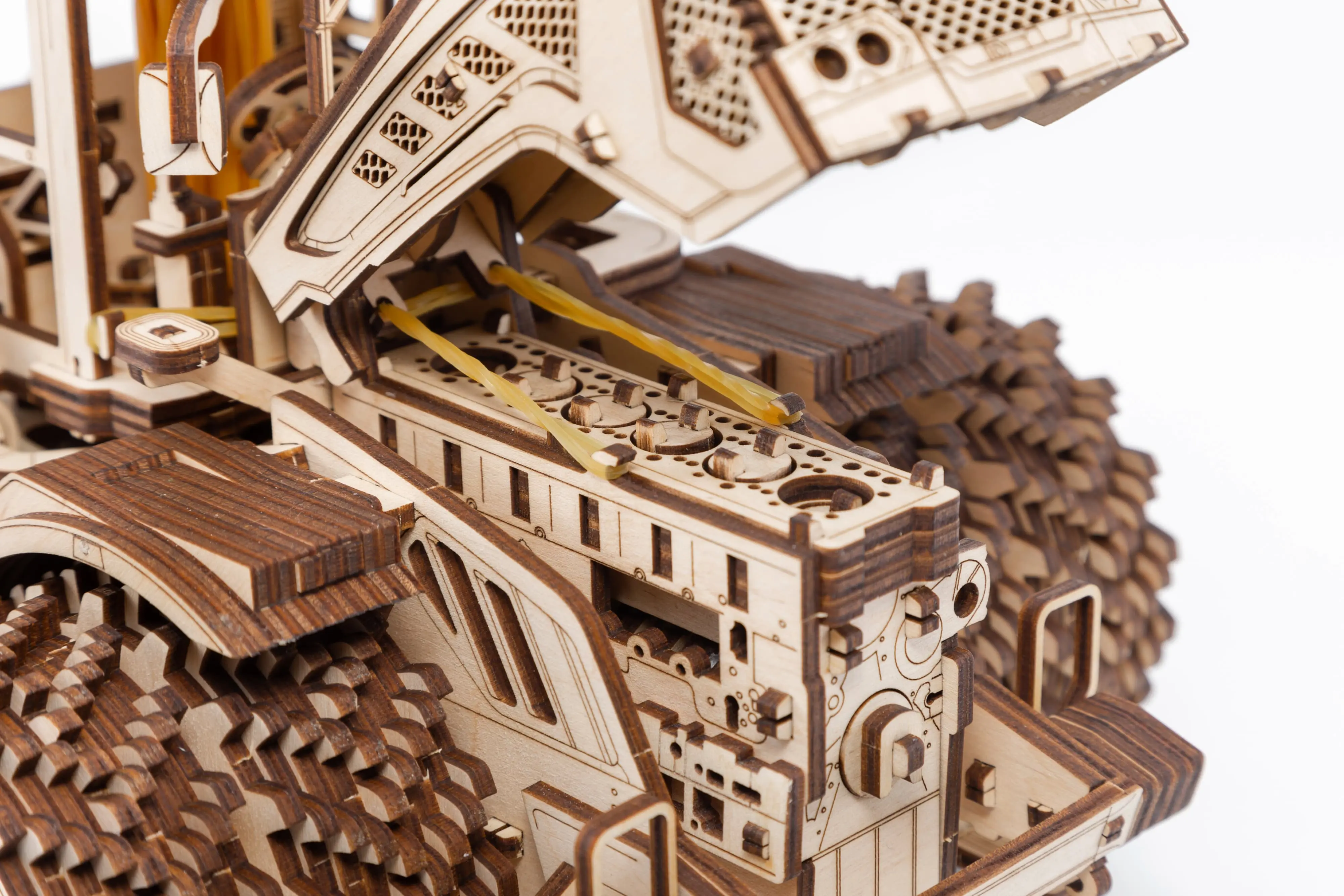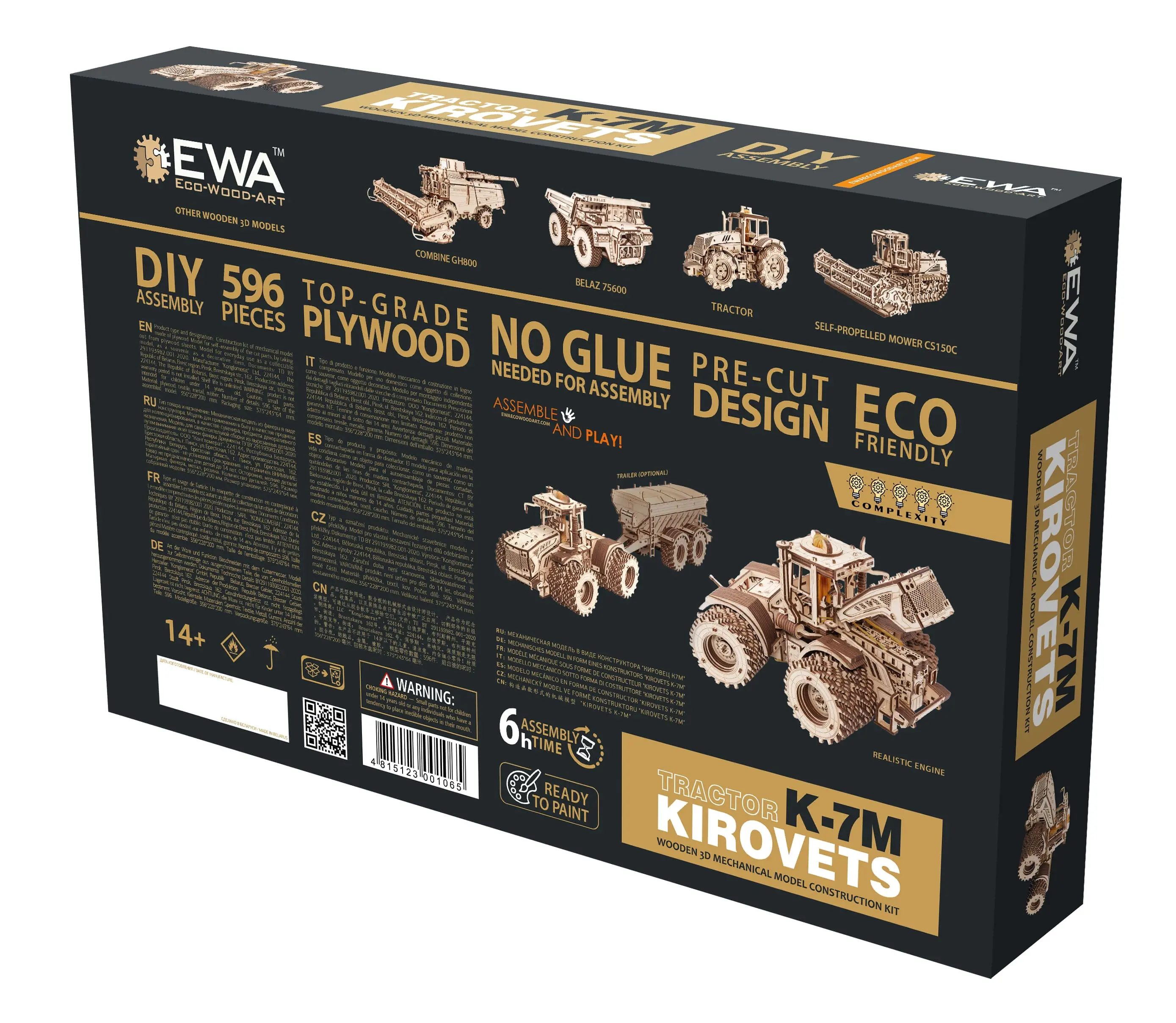 Mechaniczne drewniane puzzle 3D przedstawiająca ciągnik z napędem na wszystkie koła Kirovets K-7M firmy EWA Eco-Wood-Art.