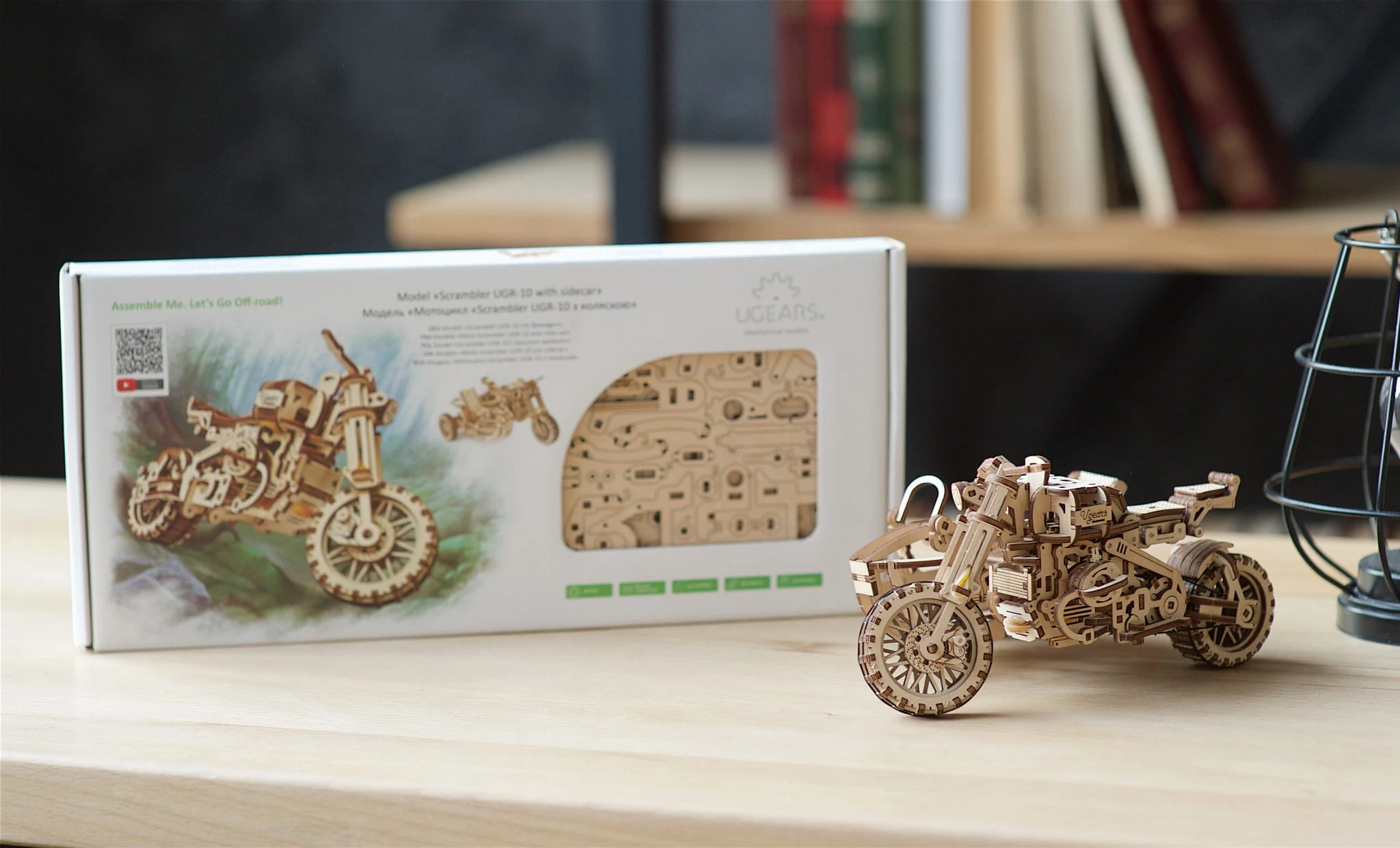 Scrambler UGR-10 to drewniany model motocykla do składania w formie puzzli dla dorosłych. Oferowany model jest dodatkowo wyposażony w odczepiany boczny wózek.