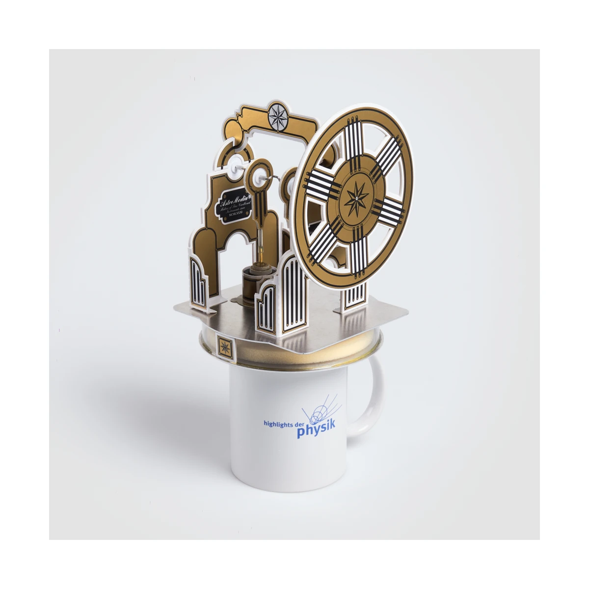 Umieść silnik Stirlinga na filiżance gorącej kawy (oczywiście wystarczy również herbata lub woda), lekko popchnij koło zamachowe w lewo, a ta energooszczędna maszyna zacznie cicho pracować – nawet przez godzinę!